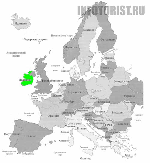 Государство Ирландия занимает большую часть (около 5/6) одноименного острова, второго по величине в группе Британских островов. Северо-восточная территория (большая часть исторической провинции Ольстер) входит в состав Великобритании.