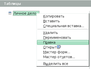 Если необходимо внести изменения в структуру таблицы, вызовите контекстное меню на вкладке Таблицы на таблице Личное дело и выберите команду Правка.