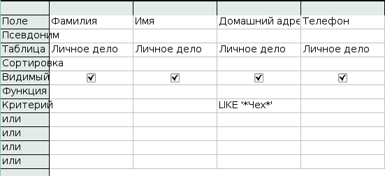 Разберем следующий пример: нужны ученики, живущие на улице Чехова. Будете добавлять условие отбора в запрос «Адресная книга», понадобится оператор LIKE и первые три буквы имени улицы.