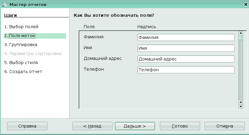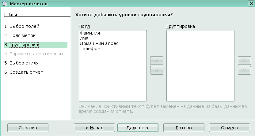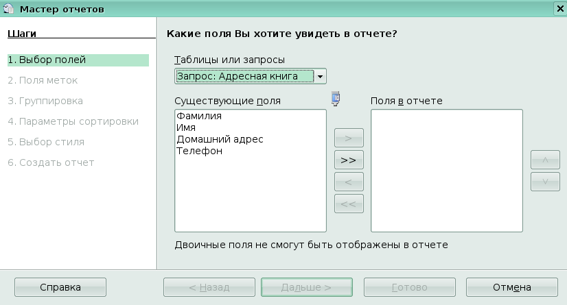 Мастер отчёта состоит из 5 шагов. Работа с мастером интуитивно ясна после работы с Мастером форм.