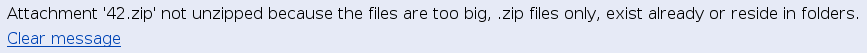If the resulting unpacked files exceed the limit of filespace for attachments, you get this warning.