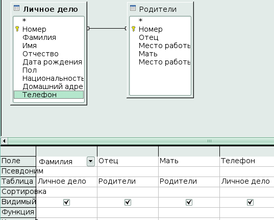 Создайте запрос Родители и Телефон. Выбираете поля Фамилия и Телефон из таблицы Личное дело, Отец и Мать из таблицы Родители.
