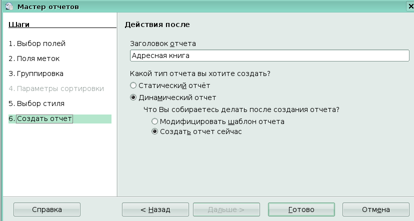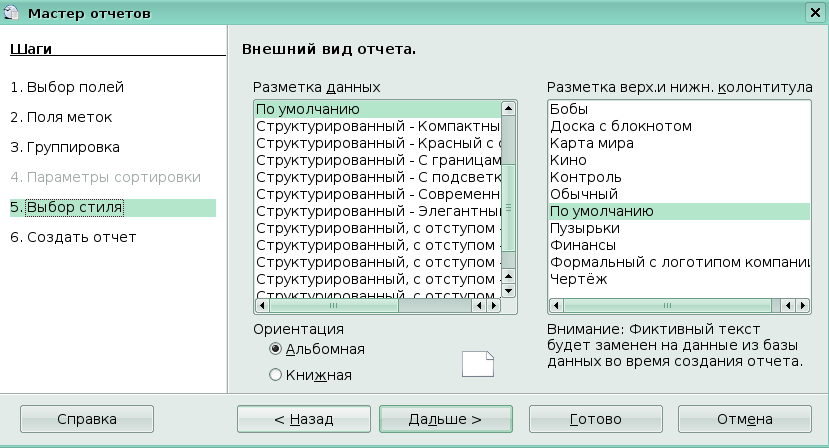 Мастер отчёта состоит из 5 шагов. Работа с мастером интуитивно ясна после работы с Мастером форм.