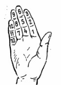 Двенадцатеричная система счисления. На ее широкое использование в прошлом явно указывают названия числительных во многих языках, а также сохранившиеся в ряде стран способы отсчета времени, денег и соотношения между некоторыми единицами измерения. Её происхождение связано, со счётом на пальцах, а именно, так как четыре пальца руки (кроме большого) имеют в совокупности 12 фаланг (рисунок)., то по этим фалангам перебирая их по очереди большим пальцем, и ведут счёт от 1 до 12. Затем 12 принимается за единицу следующего разряда и т.д.