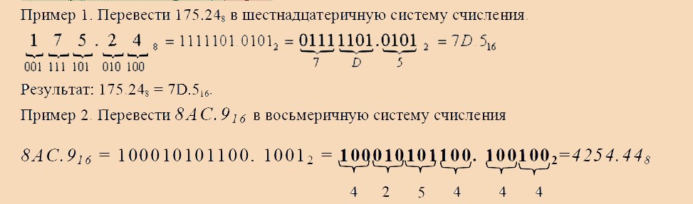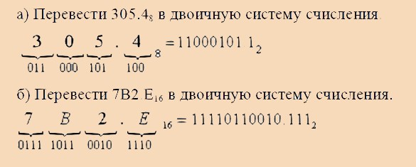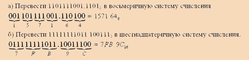 Для перевода двоичных чисел в восьмеричные или шестнадцатеричные поступают следующим образом: двигаясь от точки влево и вправо, разбивают двоичное число на группы по три (триады) или четыре (тетрады) разряда, дополняя при необходимости нулями крайние левую и правую группы. Затем триаду (тетраду) заменяют соответствующей восьмеричной (шестнадцатеричной) цифрой.