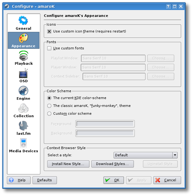 Текущий набор цветов KDE делает amaroK похожим на JuK, Классическая тема amaroK, "funky-monkey" - оригинальная раскраска amaroK. Кроме того, вы можете настроить цвета вручную.