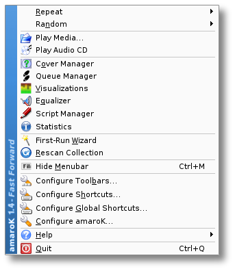 Меню под правой клавишей мыши, как несложно догадаться, вызывается щелчком по правой клавише мыши над окном проигрывателя, либо щелчком по кнопке в окне окне списка (если её нет, щёлкните правой кнопкой мыши на панели инструментов списка). Это меню используется для доступа ко всем возможным настройкам amaroK.