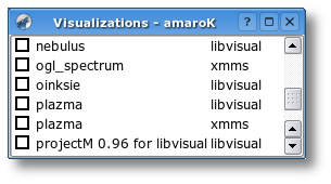 Окно визуализации служит для включения одного из возможных эффектов визуализации звука в amaroK. Список доступных эффектов находится в самом окне. для включения эффекта визуализации просто выставьте флажок напротив его названия.