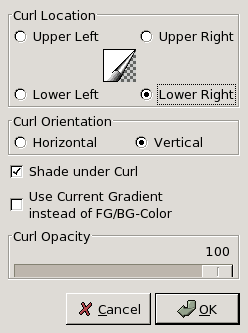 It curls a corner of the current layer or selection into a kind of cornet showing the underlying layer in the cleared area. A new "Curl Layer" and a new Alpha channel are created. The part of the initial layer corresponding to this cleared area is also transparent.