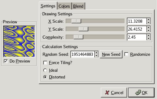You can set the X and Y scales, which determine how stretched or packed the texture will be. You can also set the Complexity of the function: a high value creates more interference or repetition in the pattern. An example is shown below.
