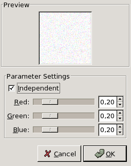 → → .Фильтр Разбросать RGB добавляет нормально распределённый шум к слою или выделению. Он использует цветовую модель RGB чтобы добавить шум к каналам красного, зелёного и синего каждой подверженной точки. Нормальное распределение означает, что только небольшие изменения добавляются к большинству точек, и большие изменения - к меньшиству. Если применить этот фильтр к серому изображению, то его гистограмма будет выглядеть как классическая колоколообразная кривая Гаусса.