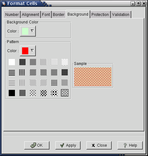 Для любой ячейки в Gnumeric можно указать цвет текста, фона или рамки. Для фона ячейки также можно указать шаблон заполнения. FIXME: Установка цвета и шаблона для фона пока что не доступна.