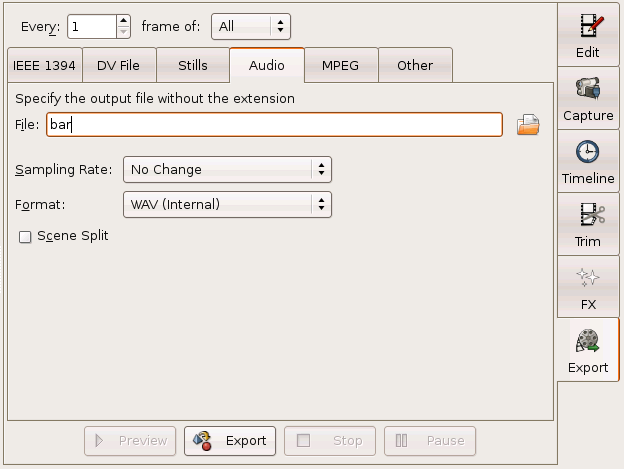 Export->Audio generates audio files from your movie. Choose the Sampling Rate and the Format from the option menus (making sure you have the required programs mentioned in parentheses). Click Scene Split to generate a separate file for each scene of the movie.