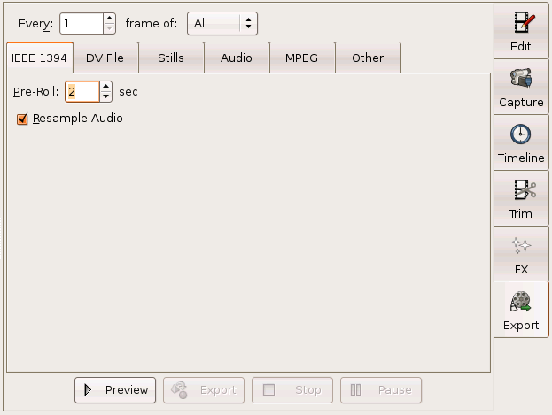 Resample Audio coerces the audio frequency to match that of the first frame of the movie because many devices do not like it to change. If you include multiple clips from different sources or recording sessions, it is very possible to have a project with mixed frequencies. Also, this option creates a locked audio output. However, if you want to send DV to the device that is not altered by software (assuming no rendered FX or imported clips), you should disable this option. Also, you should disable this for a quick preview of a long movie so that you do not have to wait for Kino to prepare the locked audio track.