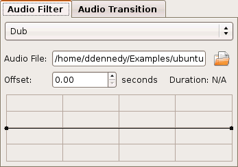 Dub replaces the original audio with that from another source specified by Audio File . Click the folder icon to open a file chooser dialog to help locate a file. Enter a value for Offset to start from the external source at a position other than the beginning.