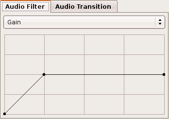 The line graph widget is a gain envelope . It lets you adjust the gain level of the audio. The horizontal axis is time, and the vertical axis is the gain. For example, you could fade from silence in the same step as performing the dub. Click anywhere on the line between the two dots to add a new dot--or control handle. Click and drag a dot to adjust. The middle position on the vertical axis is 100% gain, or the original volume level. You risk introducing clipping when you go above the mid-level, but it can be useful for soft sources. To remove a dot, drag it outside of the gain envelope widget.