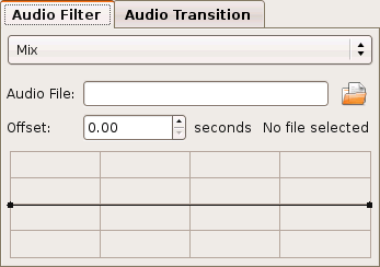 Mix combines the original audio with that from another source specified by Audio File . Click the folder icon to open a file chooser dialog to help locate a file. Enter a value for Offset to start from the external source at a position other than the beginning.