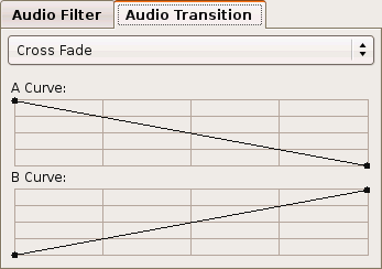 Crossfade fades clip A to silence while clip B fades from silence. This provides a nice, smooth cross-over effect. Actually, this is not strictly a crossfade since you have full control over the gain of each clip's audio; however, the intention of this is give you more control over the shape of the crossfade or to compensate for something in the audio track of the clips.